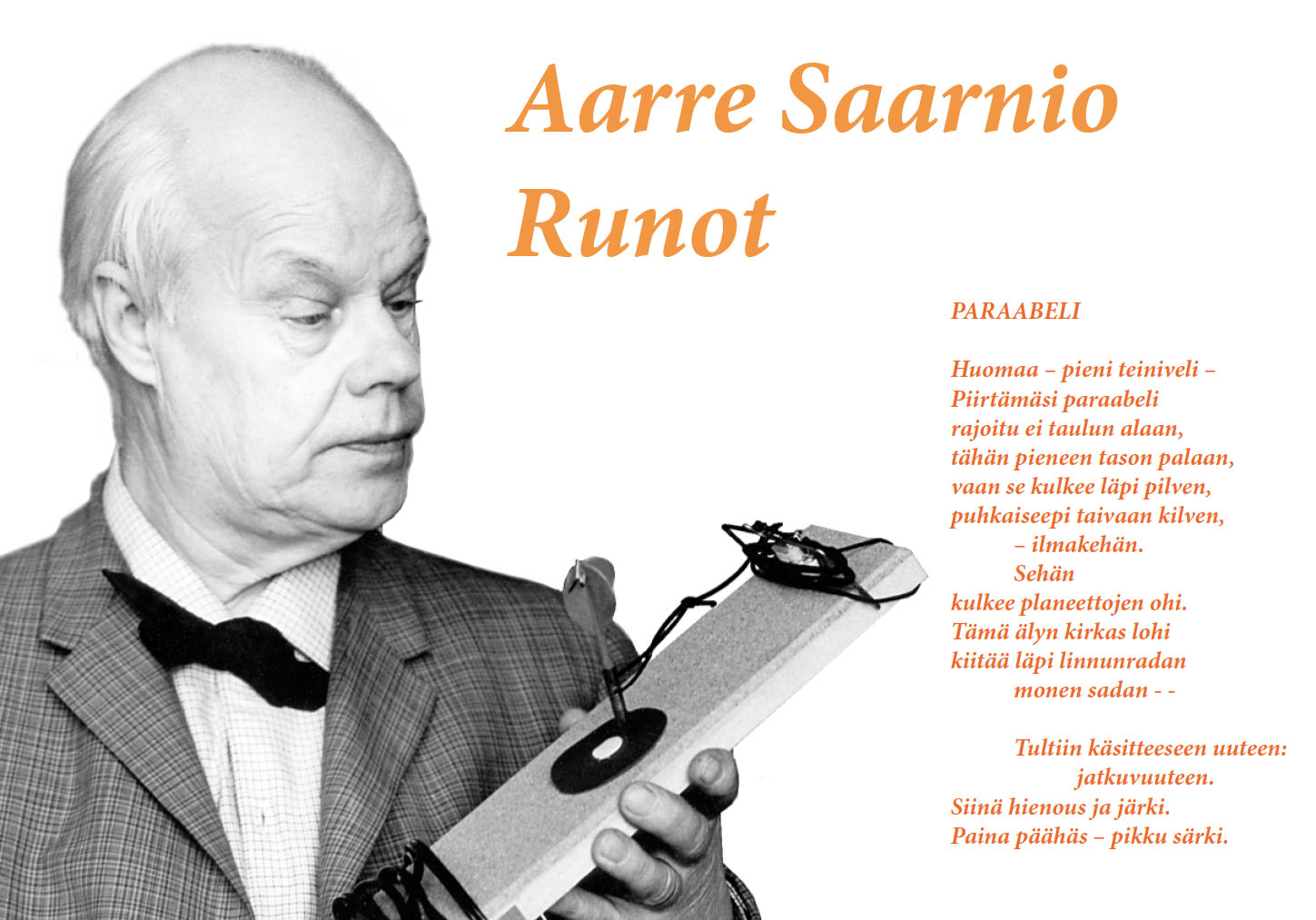 Matemaattisten aineiden lehtorina Saarnio suunnitteli ja valmisti opetusvälineitä paitsi itselleen, myös myyntiin. Viimeinen myyntiluettelo käsitti peräti 110 välinettä. Tässä kirjassa julkaistaan ensimmäistä kertaa Aarre Saarnion taidokkaat runot. Ne ulottuvat Aisopoksen malliin rakennetuista eläinrunoista pedagogisiin ja luonnontieteellisiin aiheisiin kuten ”Paraabeli”, ”Pallo”, ”Atomi” ja ”Täydellinen induktio”.
